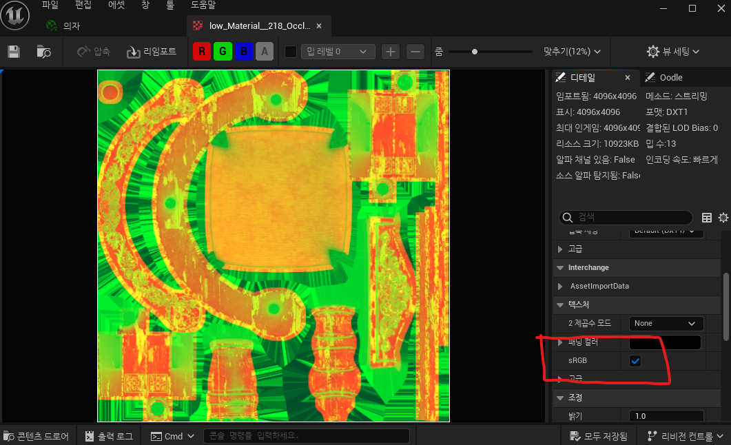 -간혹 수치변경 하지 않아도 텍스처를 아무리 수정해도 이상하게 보일 때가 있다. 그땐 노말이나 orm텍스처를 더블 클릭해서 디테일 창으로 들어 올 수 있는데 이곳에서 sRBG체크 여부를 확인 해본다.