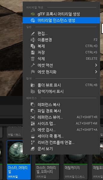 가장 상위에 있는 마스터 머티리얼(부모)을 만들고 인스턴스 머티리얼(자식)을 복사한다.