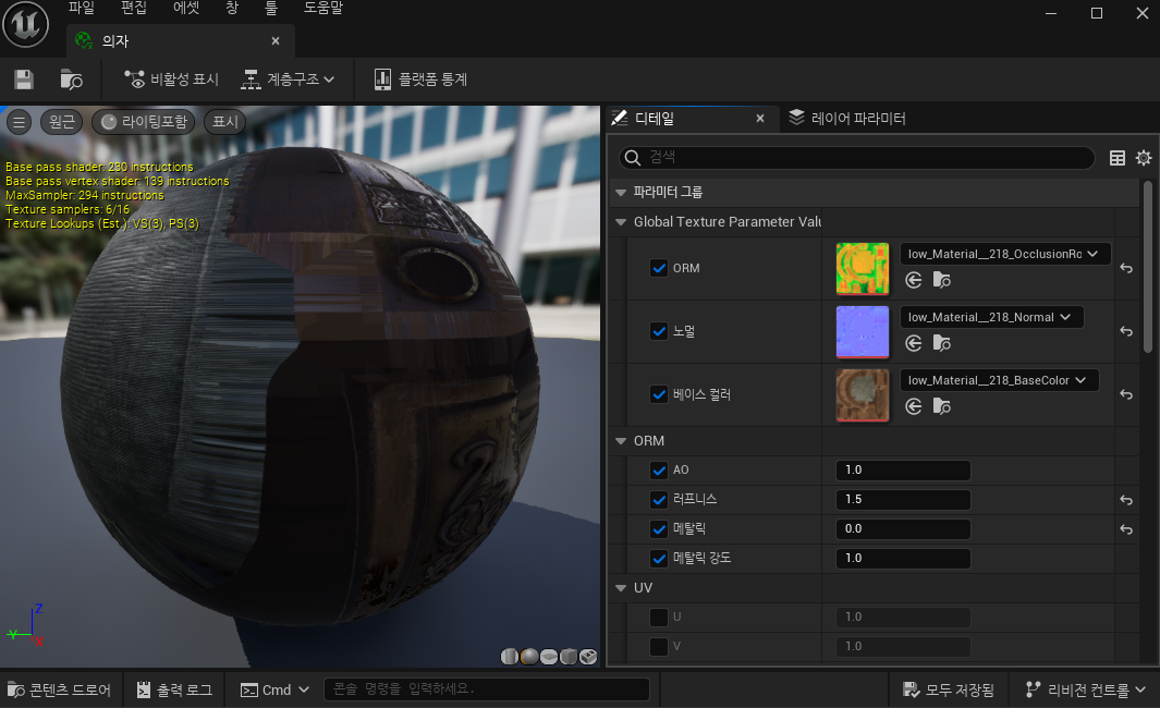 섭페 텍스처, 엔진 텍스처, 렌더 텍스처, 세개가 모두 다르게 보이기 때문에 후보정으로 엔진 안에서 조절 할 수 있는 머티리얼이 필요하다.