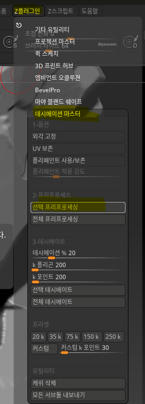 지플러그인>데시메이션>선택 프리프로세싱을 먹여줍니다. 프로세싱은 이 오브젝트를 굳혀준다고 생각하시면 됩니다.