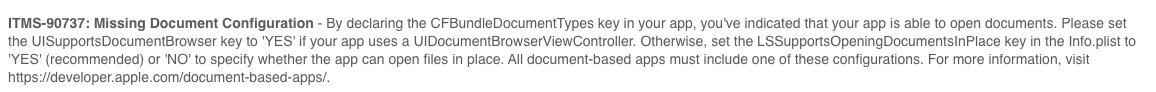 UIDocumentBrowserViewController를 사용하는 경우에는 Info.plist에서 UISupportsDocumentBrowser를 YES로 설정하십시오. 그렇지 않으면 Info.plist의 LSSupportsOpeningDocumentsInPlace 키를 'YES'(권장) 또는 'NO'로 설정하여 앱이 파일을 열 수 있는지 여부를 지정합니다.
