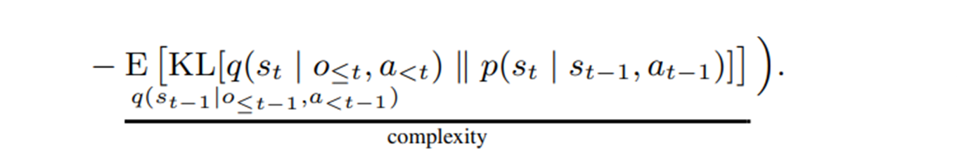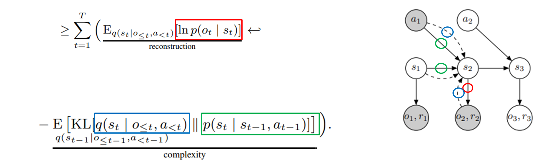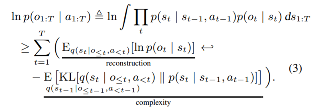 에이전트가 추론한 상태(𝑠𝑡)를 가지고 실제 관측(𝑜𝑡)을 복원할 확률을 최대화한다.