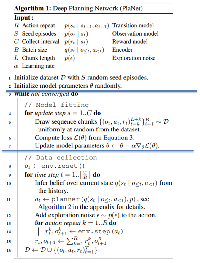 PlaNet은 계획을 사용하여 반복적으로 데이터를 수집하고, 수집된 데이터를 바탕으로 동역학 모델을 학습시켰다.
