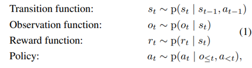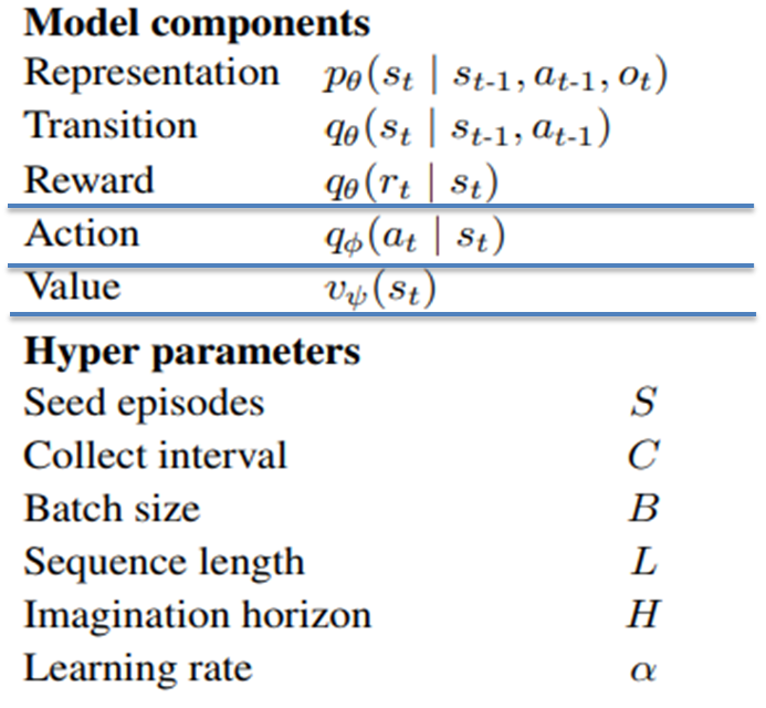 이산 타임스텝 t, 숨겨진 상태(hidden states) , 이미지 관측 , 연속적인 행동 벡터 , 보상 를 정의한다.