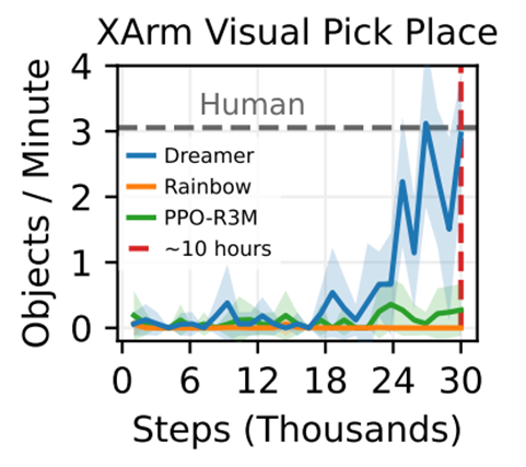 10시간 만에 XArm이 분당 평균 3.1개의 물체를 집는 속도를 달성하는 정책을 학습했으며, 이는 이 작업에서 인간의 성능과 비슷한 수준이다.