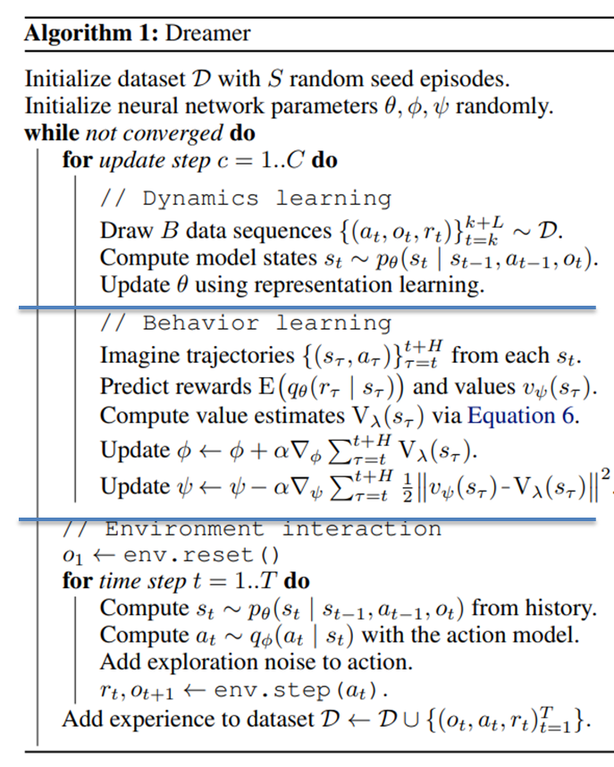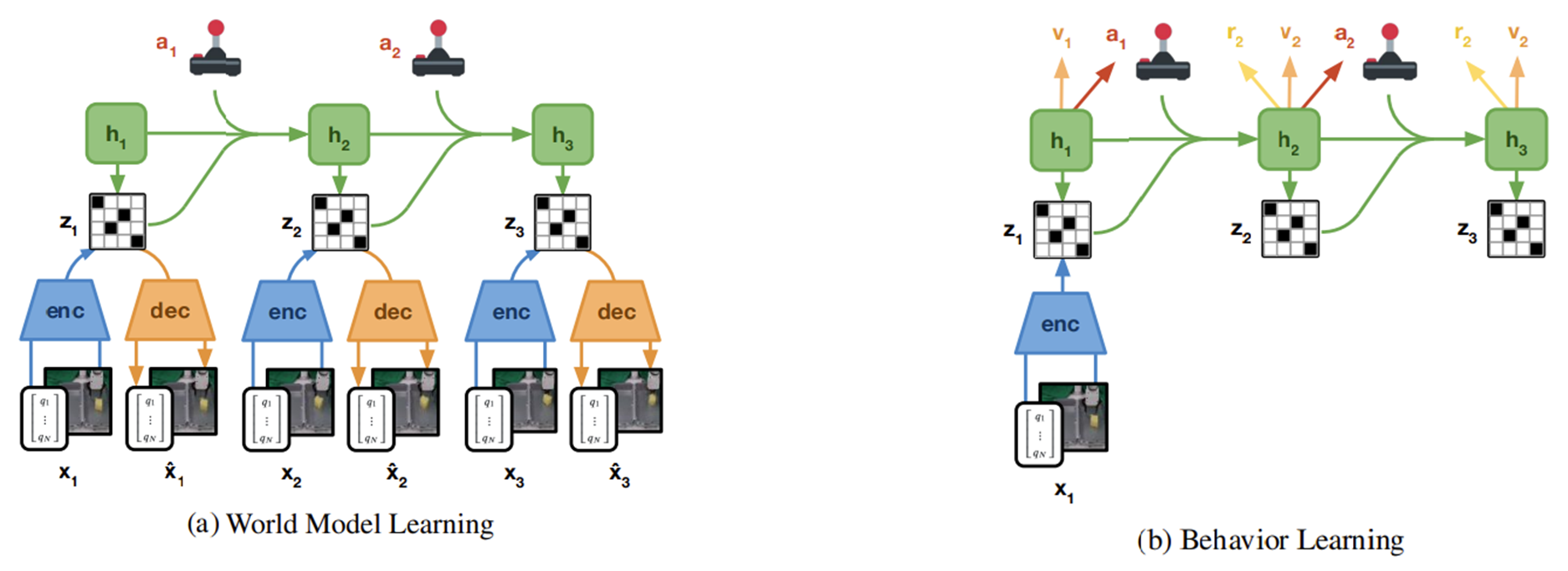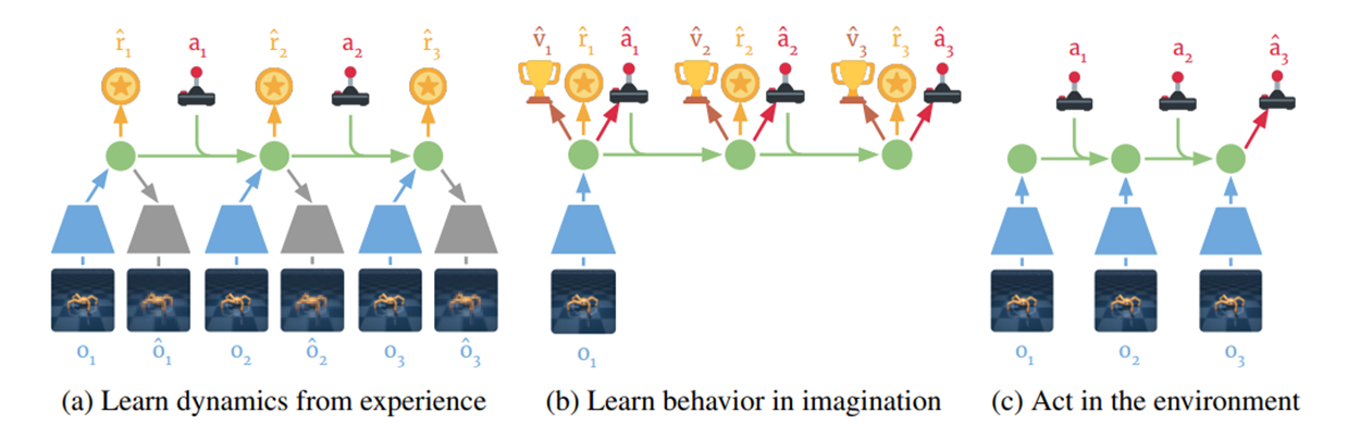 모델 구조는 월드모델(RSSM) + Actor + Critic이다. 기존 RSSM에 Actor와 Critic이 추가된 것을 확인할 수 있다.