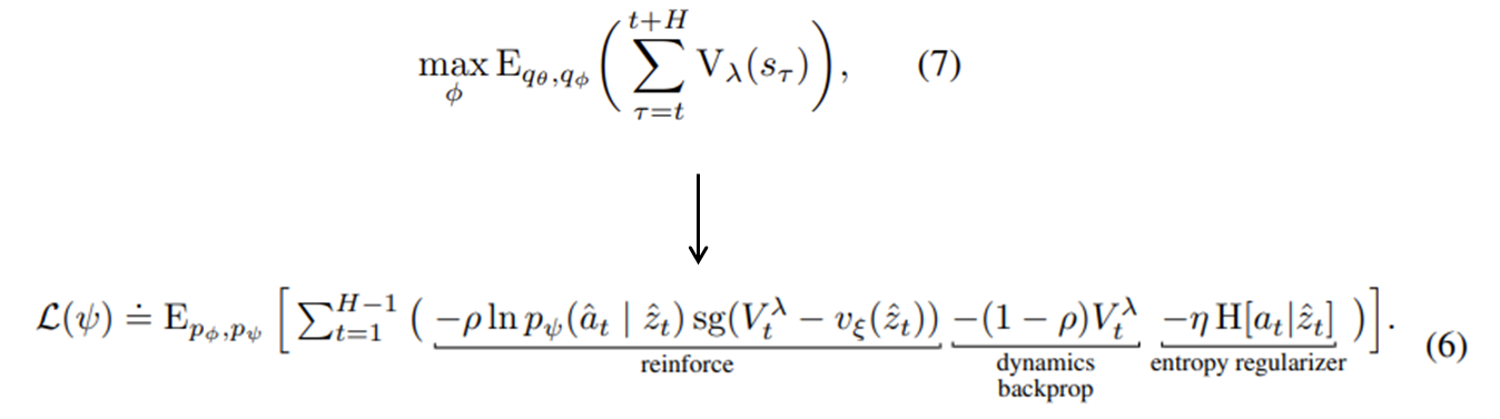 상상된 궤적을 통해 그라디언트를 역전파하여 미래 가치 예측을 최대화하는 방향으로 학습한다.