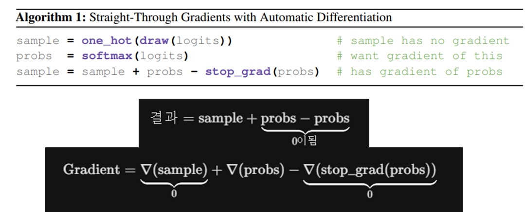 이산적인 샘플링 과정에서도 역전파가 가능하도록 Straight-Through Gradients 방식을 적용하였다.