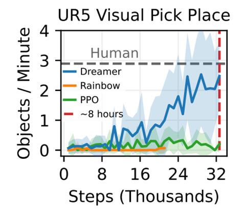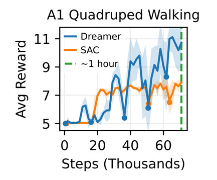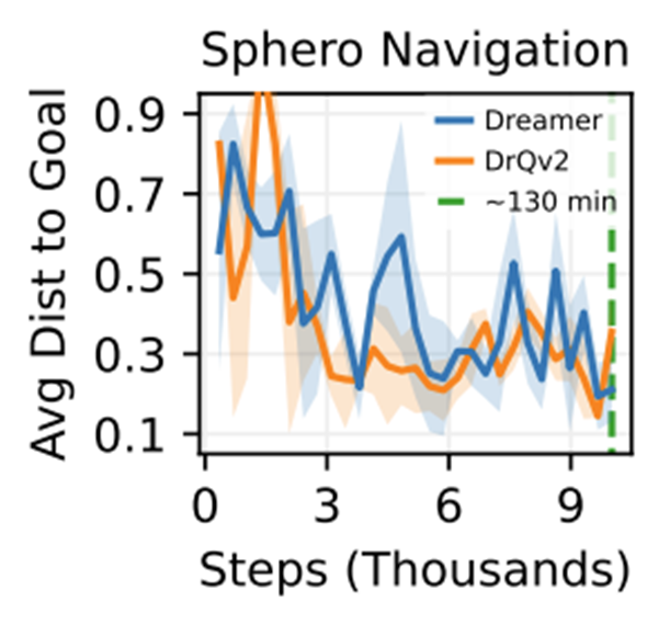 2시간 만에 Dreamer는 목표 지점으로 빠르고 일관되게 이동하고 에피소드의 남은 시간 동안 목표 지점 근처에 머무는 법을 학습하였다.