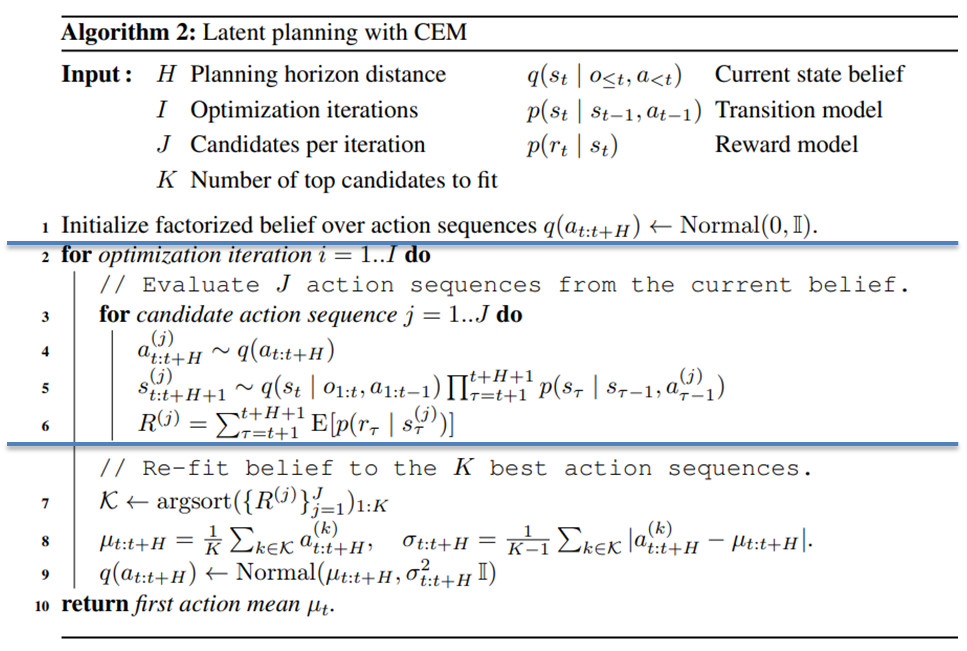 Cross Entropy Method(CEM)를 사용하여 액션을 결정한다.