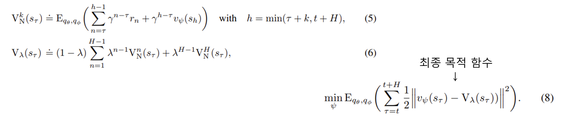 (6): Dreamer가 사용하는 방식으로, 서로 다른 k에 대한 추정치들의 지수 가중 평균( 𝜆−𝑟𝑒𝑡𝑢𝑟𝑛)을 사용한다.