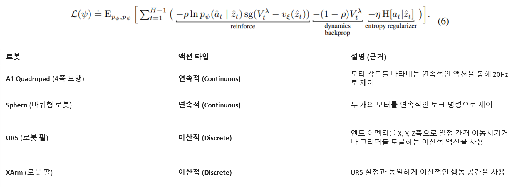 앞선 DreamerV2에서 그랬듯이 Actor 훈련 시 액션 공간에 따라 다른 Loss항 사용하였다.