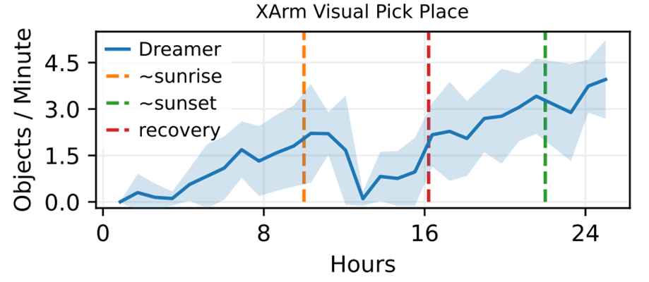 조명 조건이 급격하게 변할 때(예: 일출 시의 그림자 변화), 성능이 초기에 무너지지만 Dreamer가 곧 변화하는 조건에 적응하고 몇 시간의 추가 훈련 후에 이전 성능을 능가하는 것을 관찰했다.
