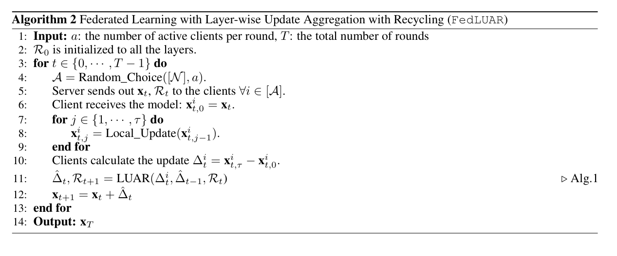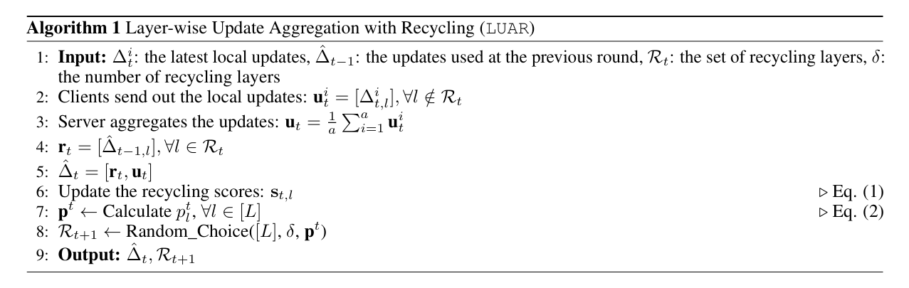 이때, 가중치 노름에 대한 그래디언트 노름의 비율이 작은, 즉, 업데이트 영향이 적을 레이어의 그래디언트는 서버로 전송되지 않고, 서버에서는 그 전 스텝의 그래디언트를 재사용한다.(이때, 확률적 샘플링을 하여 과도하게 재사용되는 것을 방지한다.)