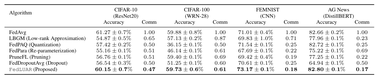 기존의 통신 효율화 기법들(Quantization, Pruning 등)과 비교했을 때, FedLUAR는 모든 데이터셋에서 압도적인 성능을 보였다.