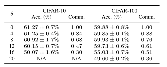 FEMNIST: 통신 비용을 18%까지 줄이면서도 정확도는 오히려 FedAvg보다 소폭 상승하거나 대등한 수준을 기록하였다.