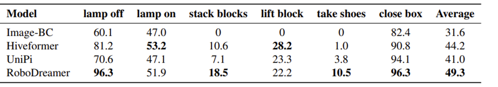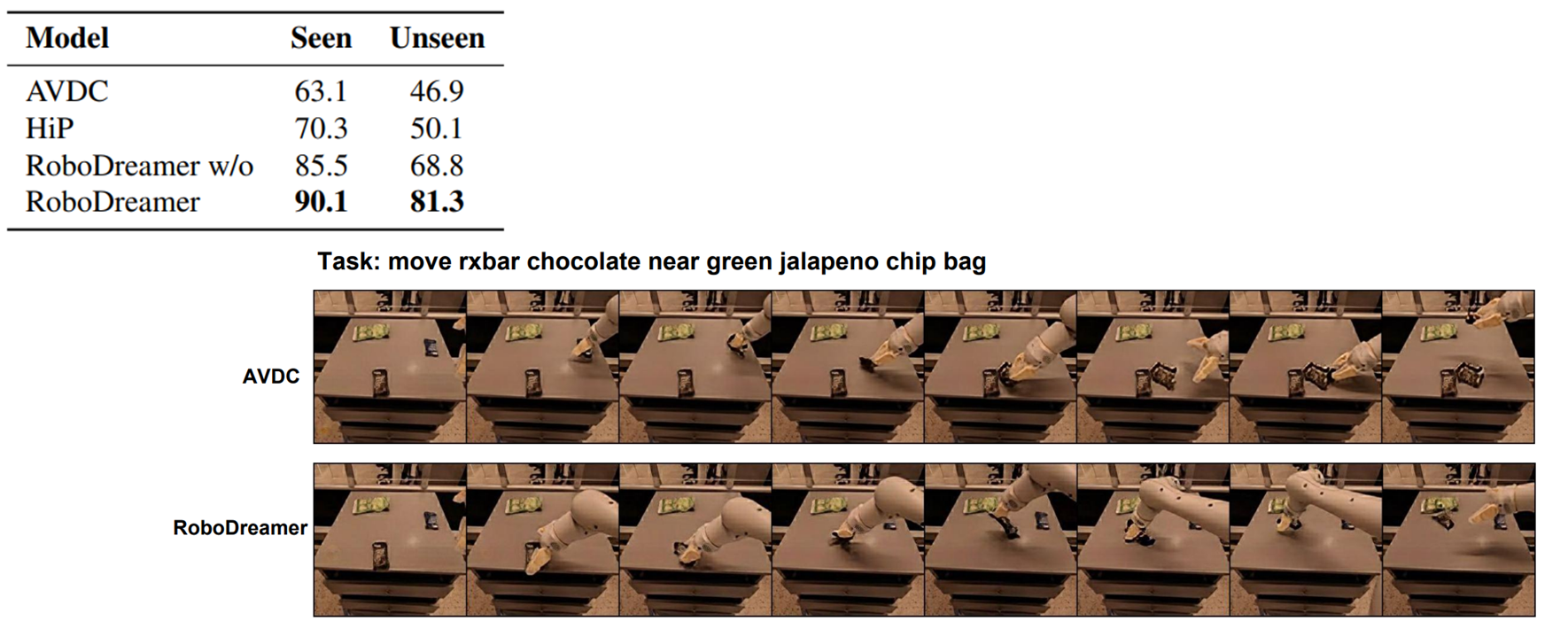 RoboDreamer는 복잡한 공간 관계와 객체 상호작용을 정확하게 포착하는 비디오 생성에 있어 상당한 진전이 있었다고 한다.