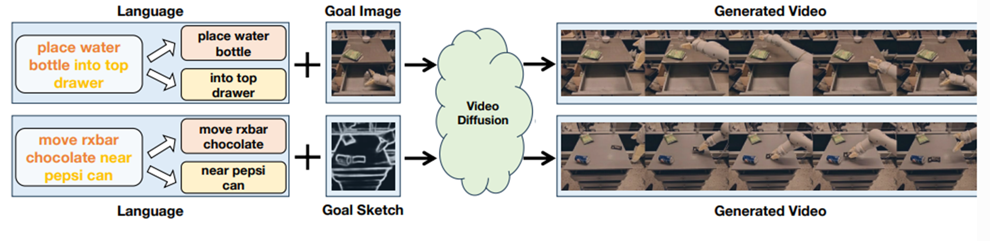 비디오 생성 모델로 비디오를 생성하고 비디오로부터 액션을 예측하는 파이프라인으로 구성되어있다.