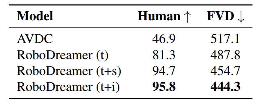 RoboDreamer (t+s)와 (t+i)는 인간 평가(Human)에서 강력한 성능을, 비디오 품질(FVD)에서 좋은 결과를 달성했다.