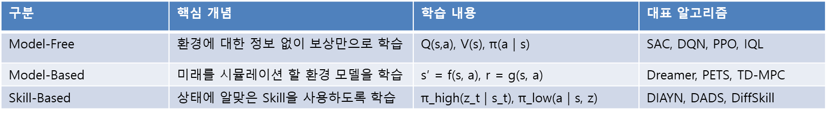 Skill-Based: “컵을 잡는다”와 같은 고수준 행동 시퀀스(스킬)들을 모델(π_low)에 미리 학습시켜두고, 모델(π_high)이 스킬을 선택하게 하여 정책이 고려할 시계열 길이를 줄여 장기 과제 해결에 효과적이다.