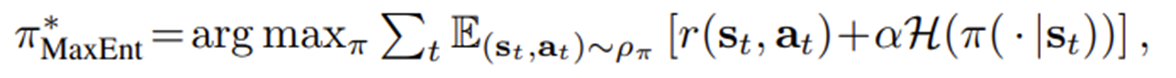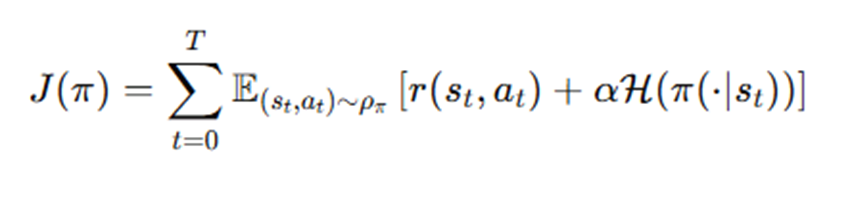 보상함수에 엔트로피항을 추가하여 목적함수를 나타냄.
