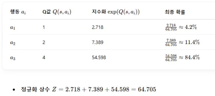 정책이 Q벨류의 Softmax분포를 닮아가는것이 학습의 목표이다.