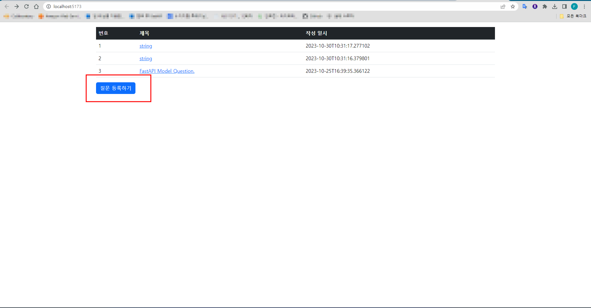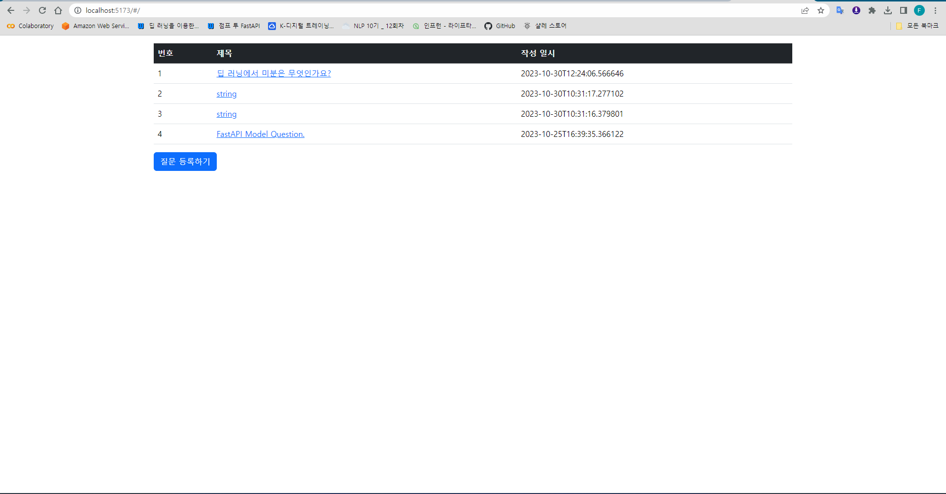 이제 질문 등록 기능이 잘 동작하는지 확인해보자. 우선 메인 화면에 접속하면 다음과 같이 '질문 등록하기' 버튼이 나타난 것을 확인할 수 있다.
