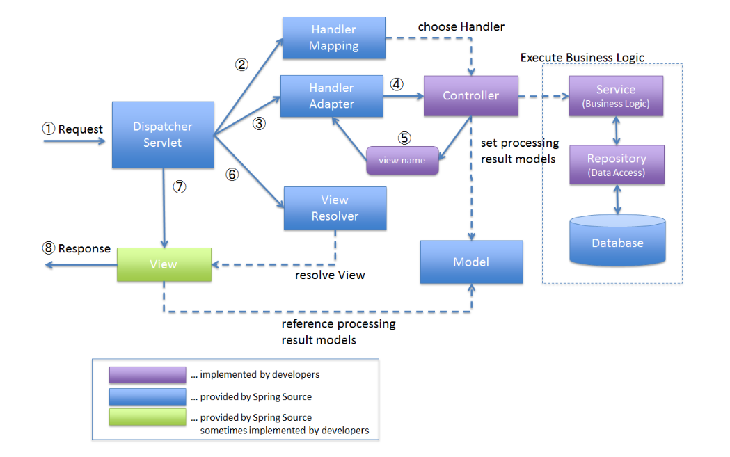 DispatcherServlet은 웹 애플리케이션의 진입점이며, 클라이언트로부터 들어오는 모든 요청을 처리하는 중앙 컨트롤러 역할을 합니다. 이후에는 Spring 구성 파일에 따라 요청을 처리하는데 필요한 각각의 구성 요소를 찾아내고 실행합니다. 이를 통해 Spring MVC는 유연하고 확장 가능한 웹 애플리케이션을 만들 수 있게 됩니다.