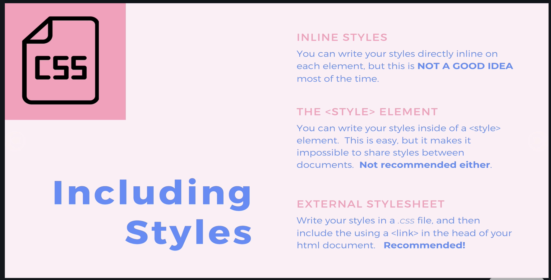 css를 사용하는 방법은 html에서 직접 하나하나에 입력하거나 위의 head에서 style을 만들거나 아니면 따로 .css를 만들고 html에 link를 거는 방법이 있다.