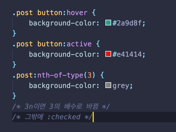 hover는 마우스를 가져갔을 때 변화, active는 클릭했을 때의 변화 nth-of-type은 옆의 ()의 순서에 해당되는 것이 변한다.