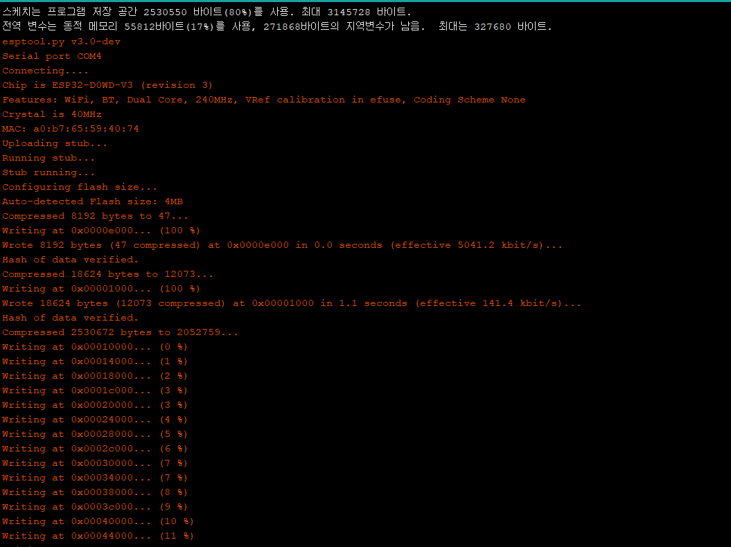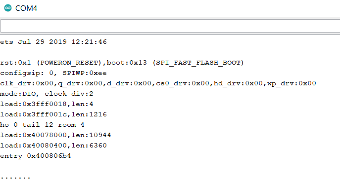 리셋 버튼을 눌러준 다음 시리얼 모니터를 확인하면 이런 문구가 뜬다. 여기서 또 잠깐 기다려주면