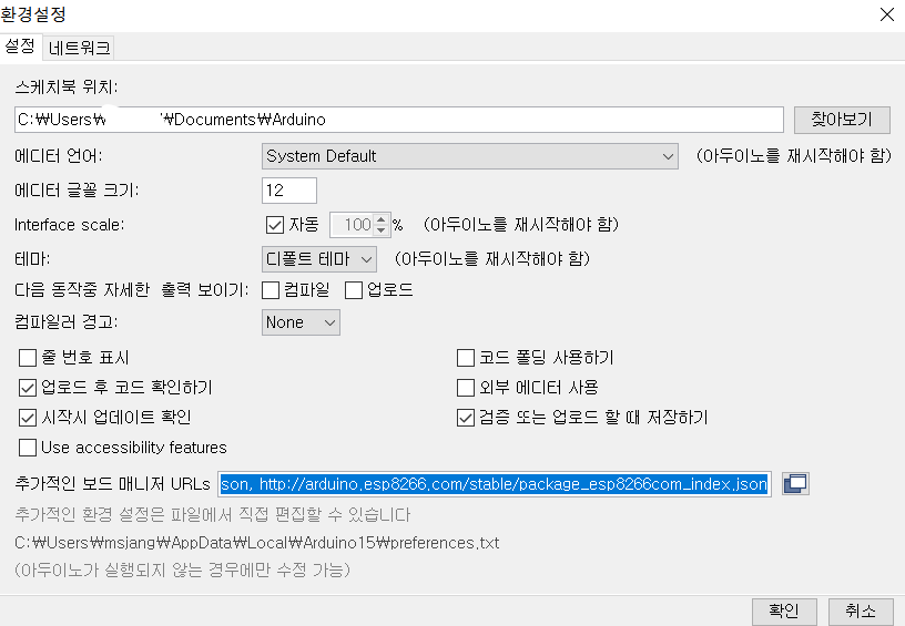 다음은 파일-환경설정에 들어가서 추가적인 보드매니저를 넣어준다.