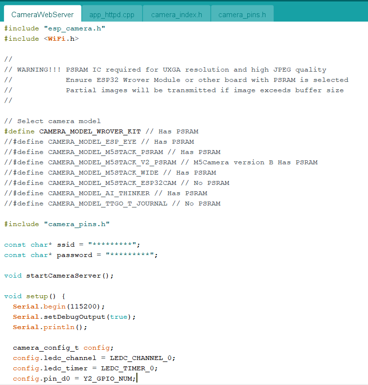 #define CAMERA_MODEL_WROVER_KIT 부분은 각주 처리