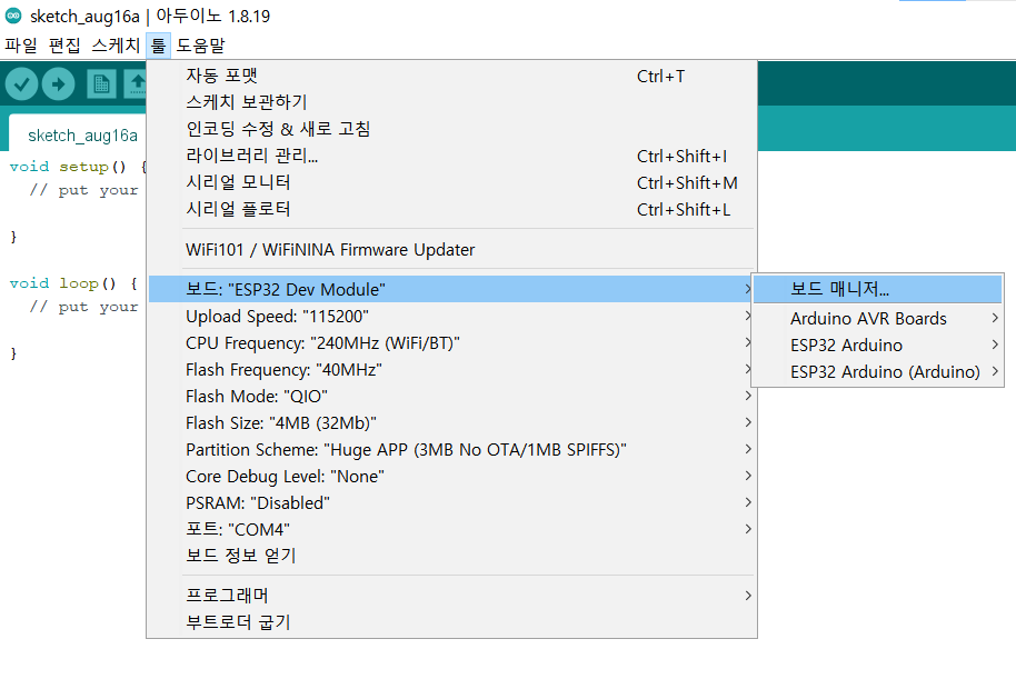 ide 1.8.19를 다운받고 esp32 보드는 2.0.10으로 해뒀더니 작동이 안 한 듯 싶다. 아마 esp 버전이 아두이노 소프트웨어의 버전보다 더 낮아야 하는 듯