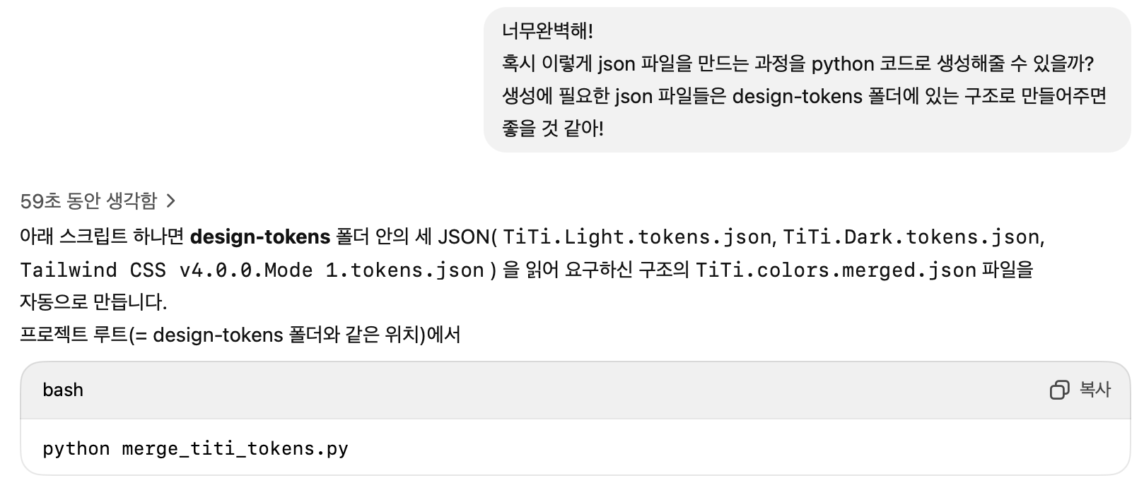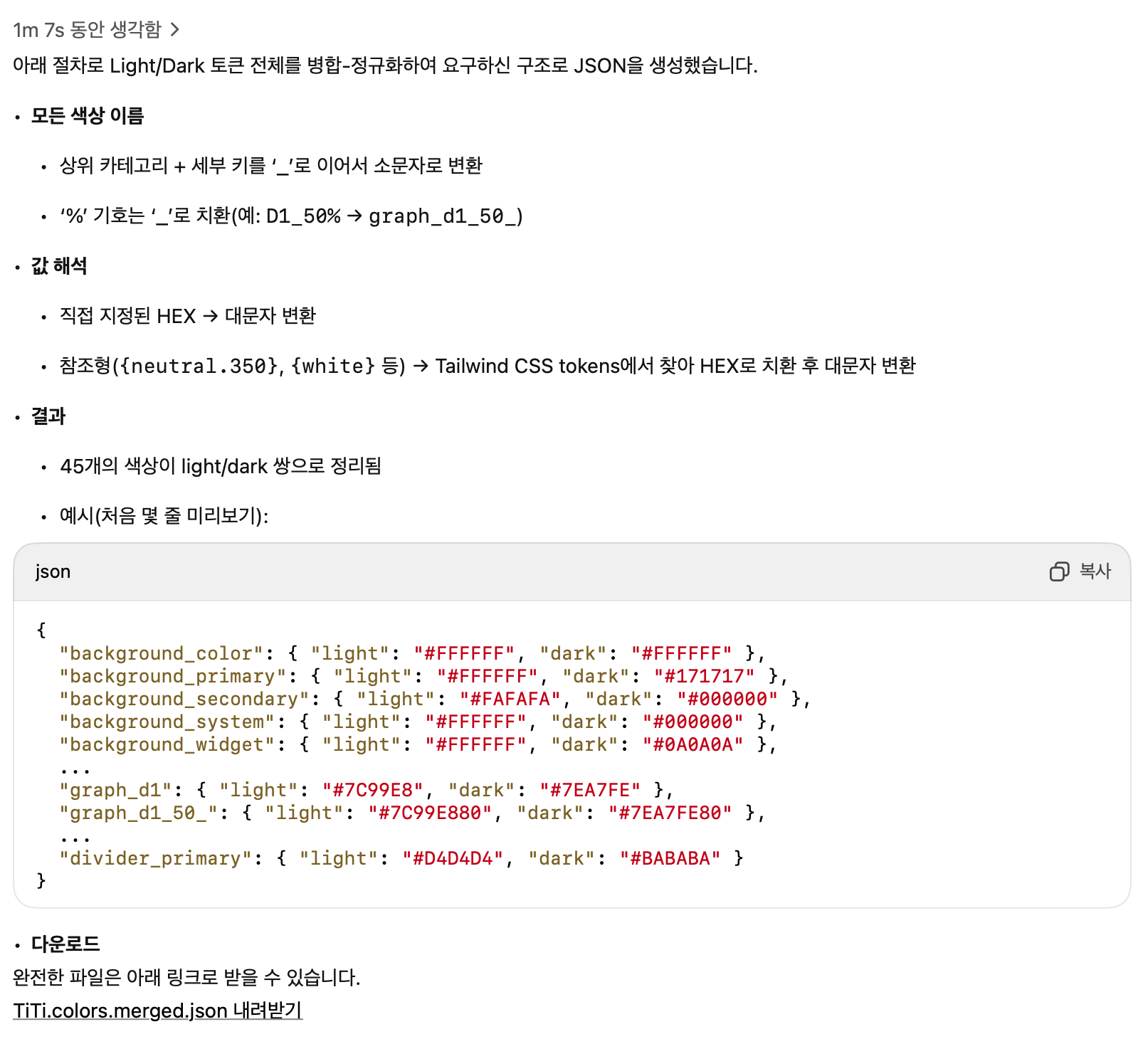 GPT와 위 문제해결에 대해 논의해본 결과 해당 형태의 json 파일이 생성된다면 이 json 파일을 토대로 Assets 없이 light, dark 모드간 전환 가능한 컬러를 만들 수 있다고 한다.