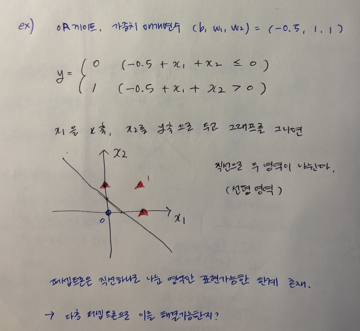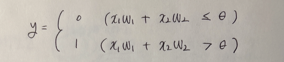 x1과 x2는 입력신호, y는 출력신호, w1과 w2는 가중치 (가중치가 클수록, 해당 신호 중요)