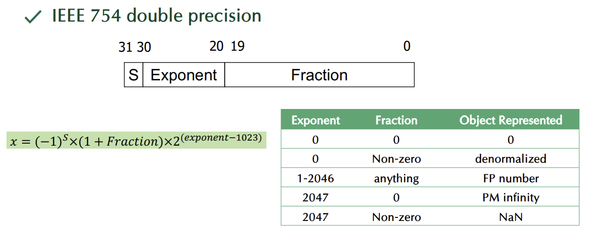 - Double precision(배정밀도, 11비트 지수): 최대 E = 2047