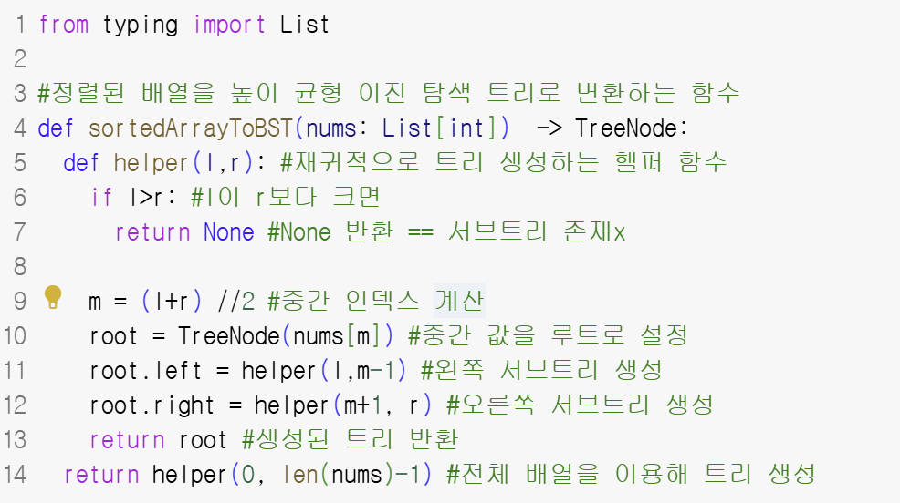 사용 방법: def sortedArrayToBST(nums: List[int]) -> TreeNode: