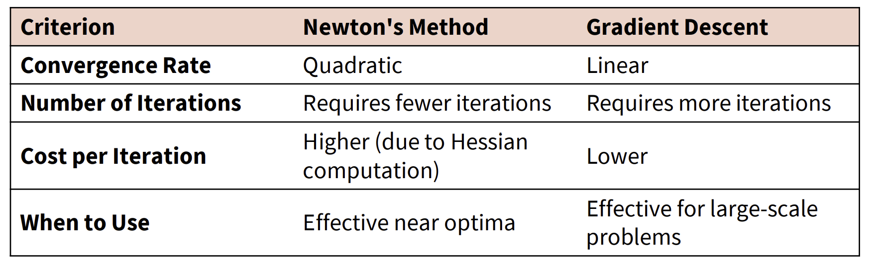 2. Newton: 이차(quadratic) 수렴 속도, 적은 반복 횟수, Hessian 행렬 계산으로 인한 반복당 비용 매우 높음, 최적점(optima)에 가까울 때 효과적
