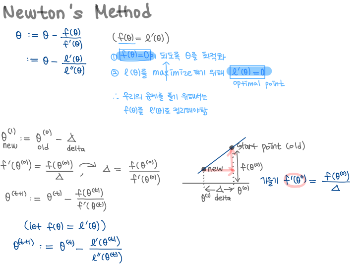 - 뉴턴 방법: ℓ(세타)를 최대화하는 방법