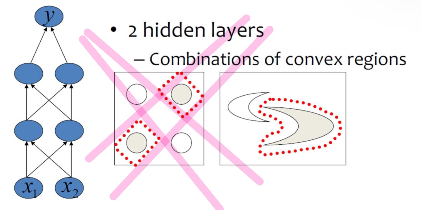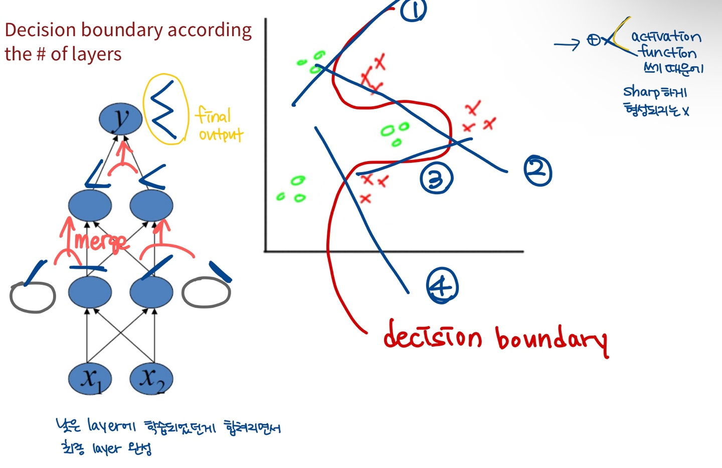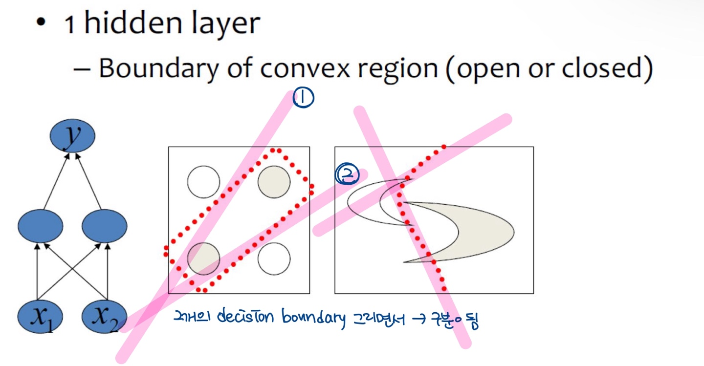 - 하나의 hidden layer로는 (==1개의 decision boundary) 문제 해결 x