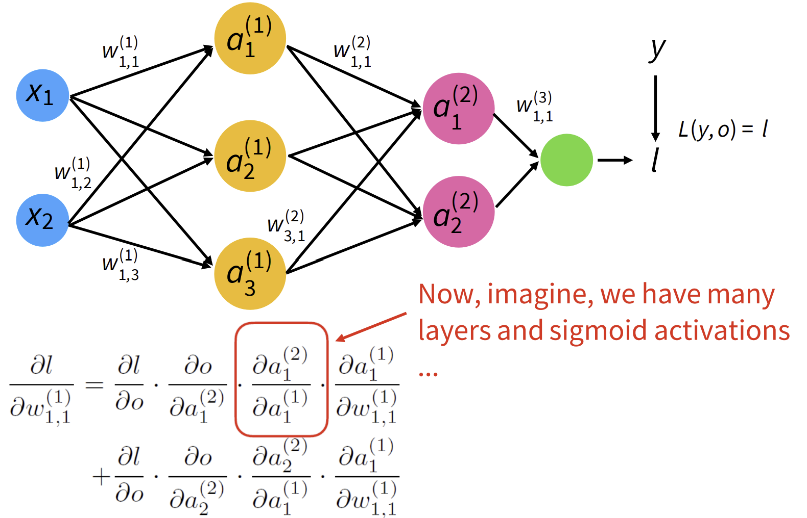 -> activation function을 미분한 것들이 계속해서 곱해지게 됨