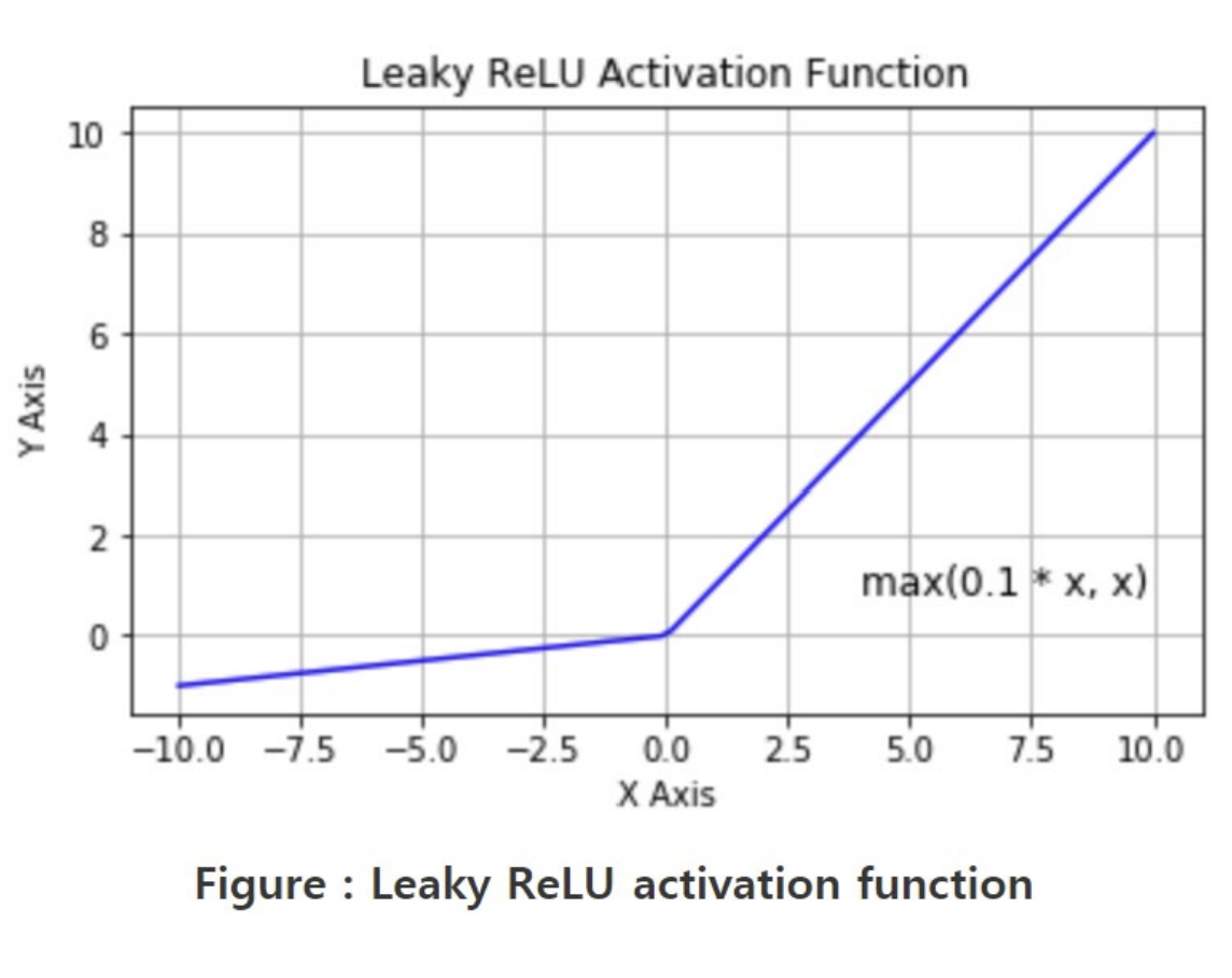 - x<0일 때 작은 positive slpoe(0.1)을 더하여 negative 영역을 완전히 죽이지 않음