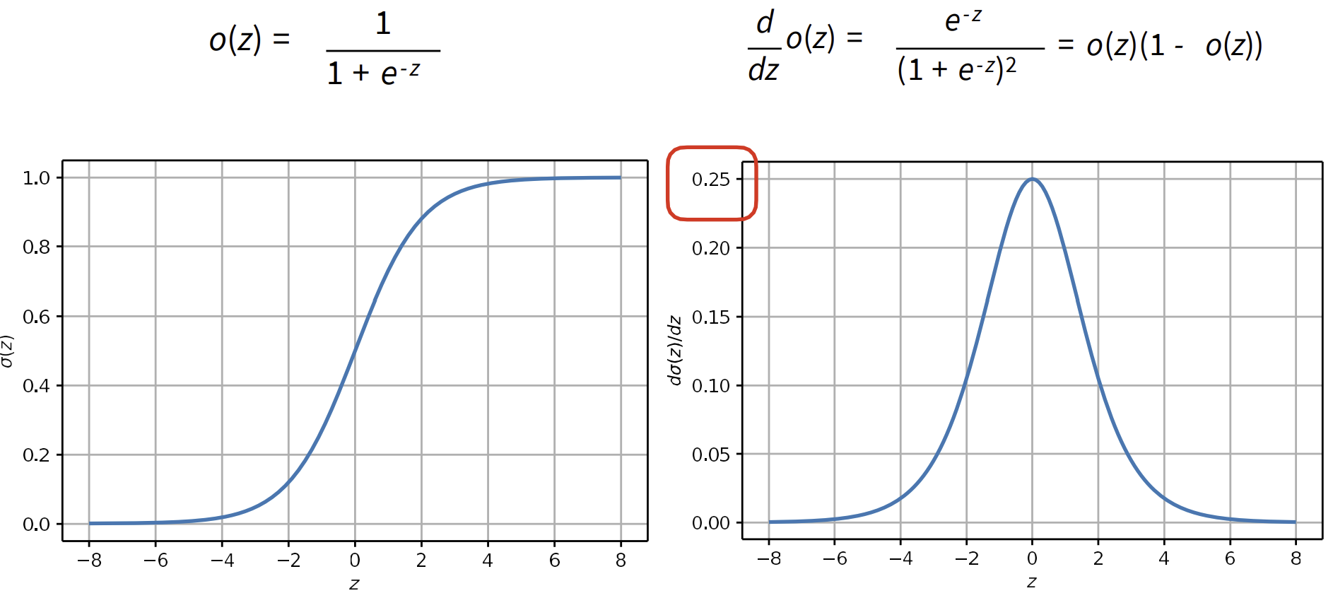 - 시그모이드 함수의 미분한 함수의 maximum(==largest gradient)은 0.25