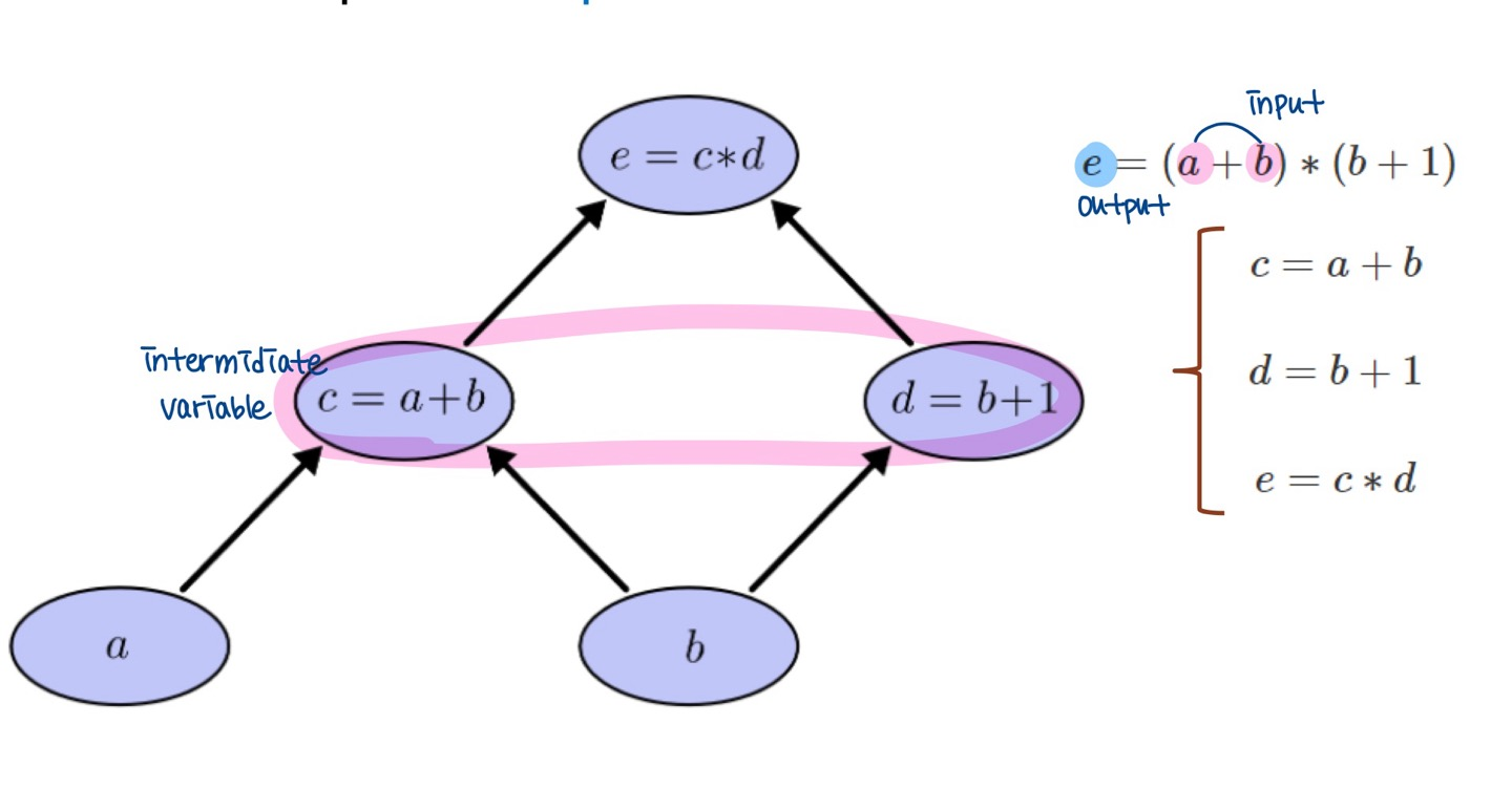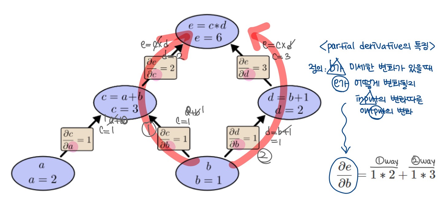 - 즉, 그림에서는 b에 미세한 변화가 있을 때 e가 어떻게 변화될지를 나타냄 (편미분에서는 다른 input인 a를 상수취급함으로 a의 변화는 고정됨)