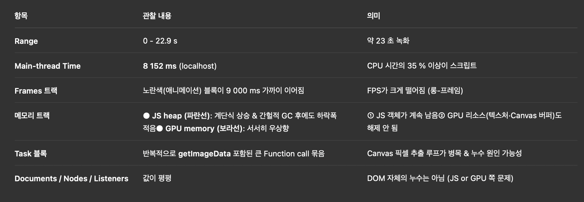 이제 하나씩 퍼포먼스와 메모리 탭 기반으로 분석한 내용을 설명하겠다.