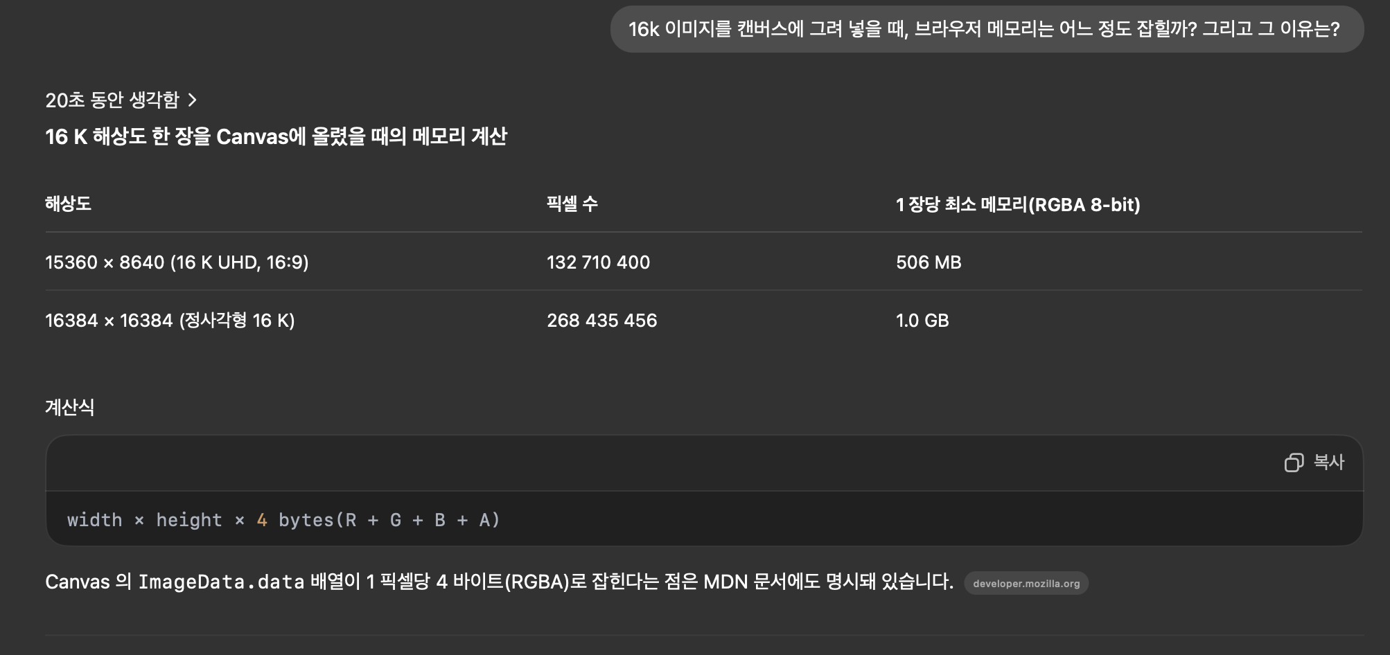 이때, 캔버스 기반인 Konvajs(https://konvajs.org/)를 쓰지만, 결국 본질은 캔버스에 16k x 16k 초고화질 사진을 그리는 데 가용되는 메모리 용량이었다.
