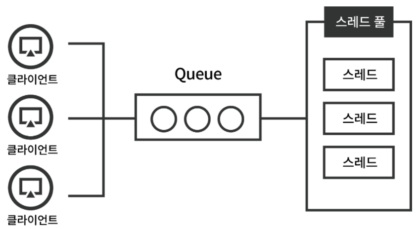 Thread pool: Request들어오면 새로운 thread생성 되고 모든 처리가 해당 thread에서 처리