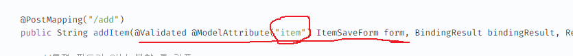 @ModelAttribute() 속성에 모델 이름을 "item" 으로 등록 해놨다. 그 이유는 뷰 템플릿에는 현재 th:object= "item"으로 등록 되어있기 때문에 이 코드들을 변경하기 싫어서 위와 같이 설정을 해주었다.