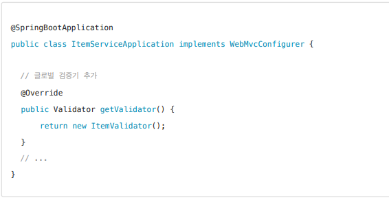 무슨 말이냐면 앞 장에서 우리가 임의로 만든 ItemValidator 를 특정 컨트롤러만이 아닌 모든 컨트롤러에서 사용 할 수 있게 글로벌 Validator 로 등록 하는 방법이 있었다.